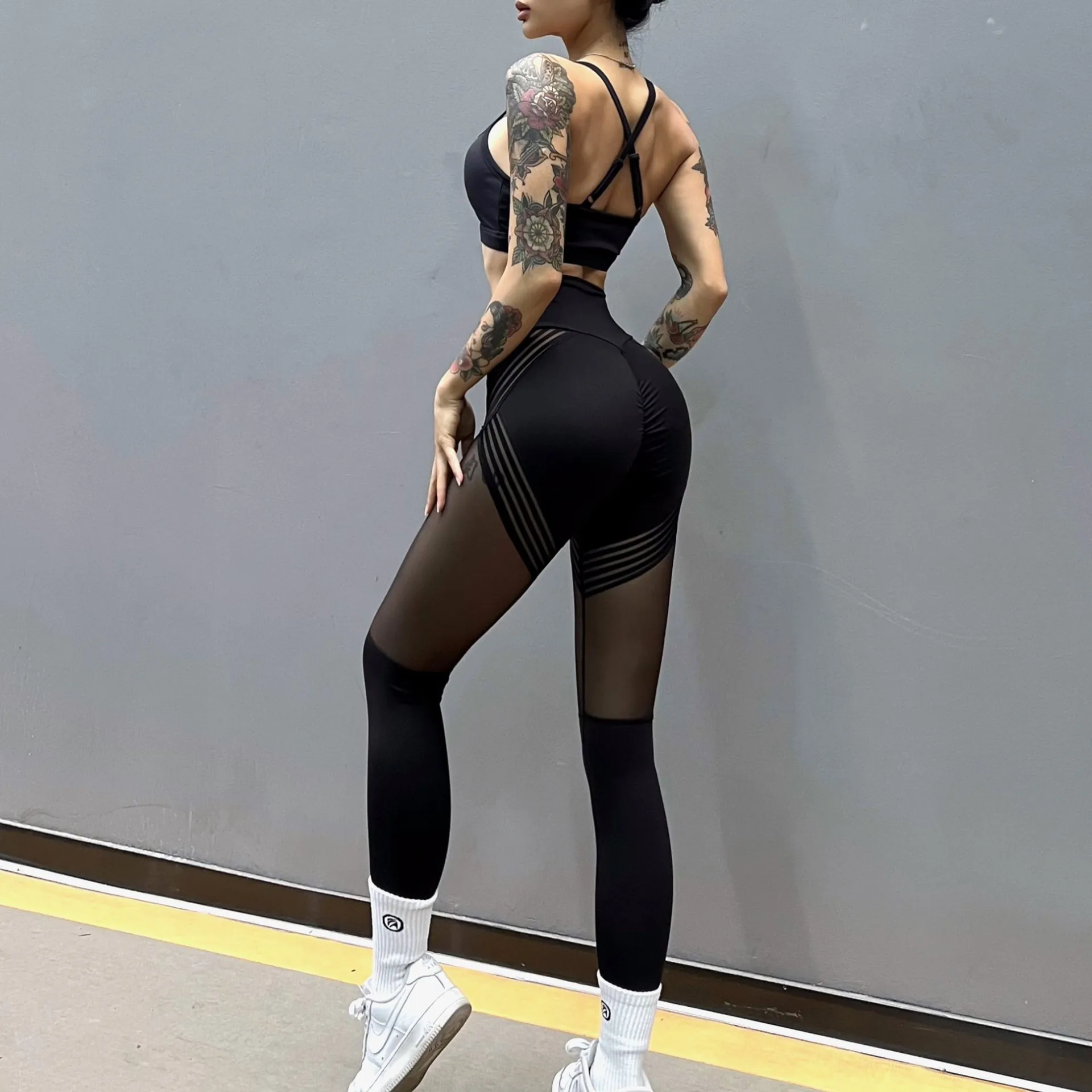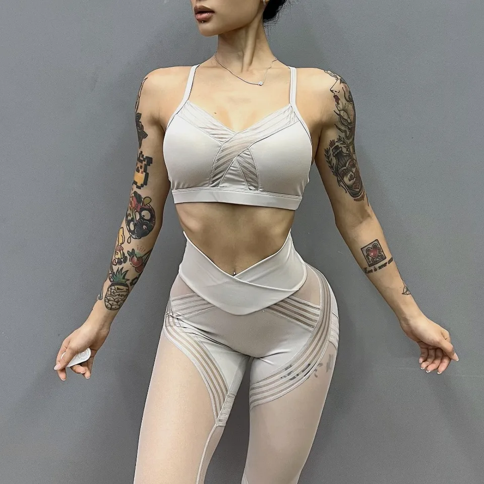 Sexy Mesh Bra & High Waist Lace Panel Leggings Set - Women's Fitness Yoga Outfit Muscle Suit