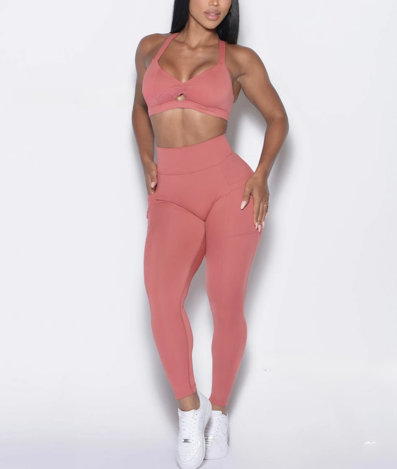 Elevate your workout wardrobe with our High-Waist Peach Butt Leggings and Adjustable Strap Sports Bra Set! This stunning fitness outfit is designed to enhance your natural curves and provide ultimate comfort during your workouts. The high-waist leggings with peach butt design lift and contour your buttocks, while the adjustable strap sports bra offers personalized support and breathability. Made from stretchy, quick-dry fabric, this set keeps you cool and comfortable even during intense sessions. Perfect for yoga, gym training, running, and everyday wear.