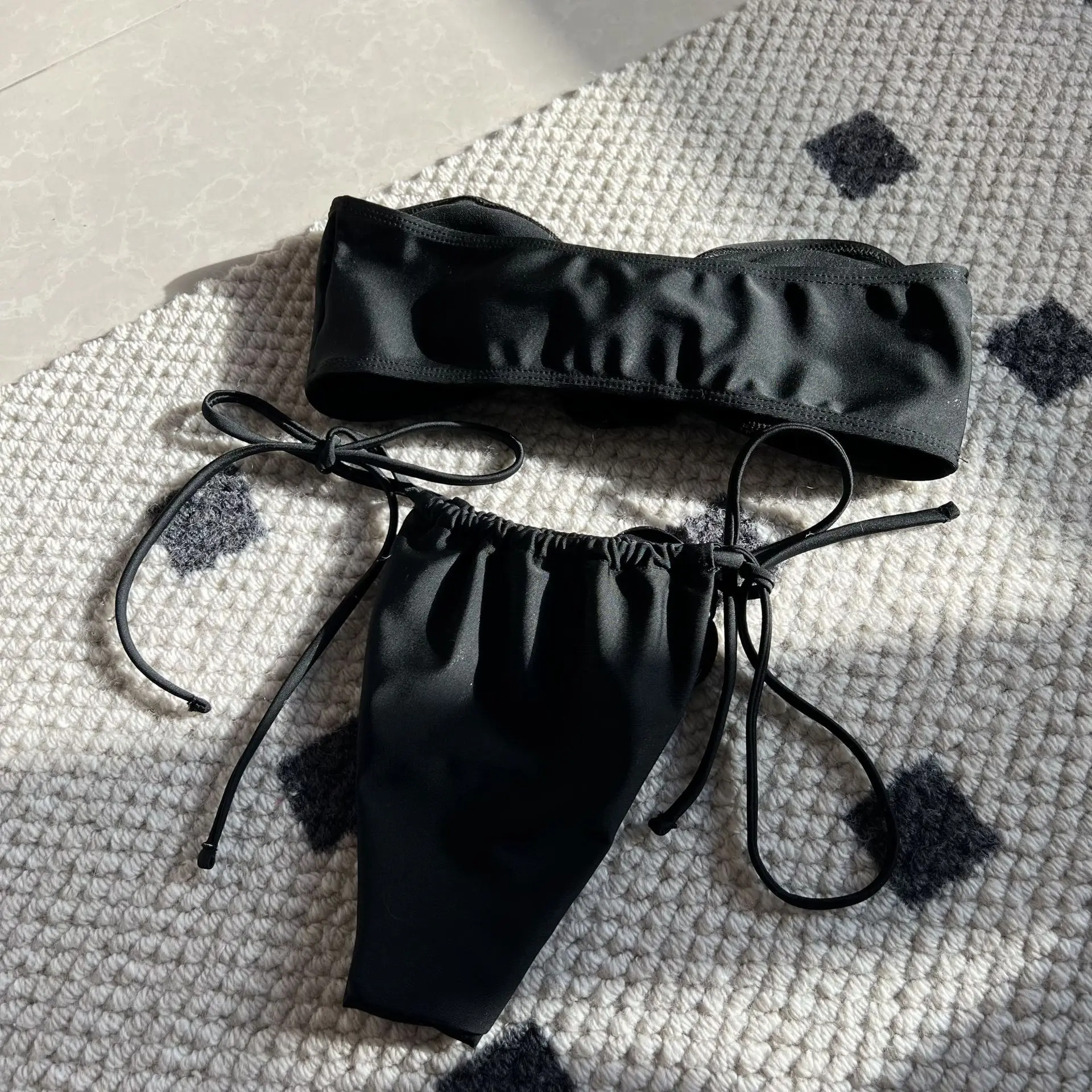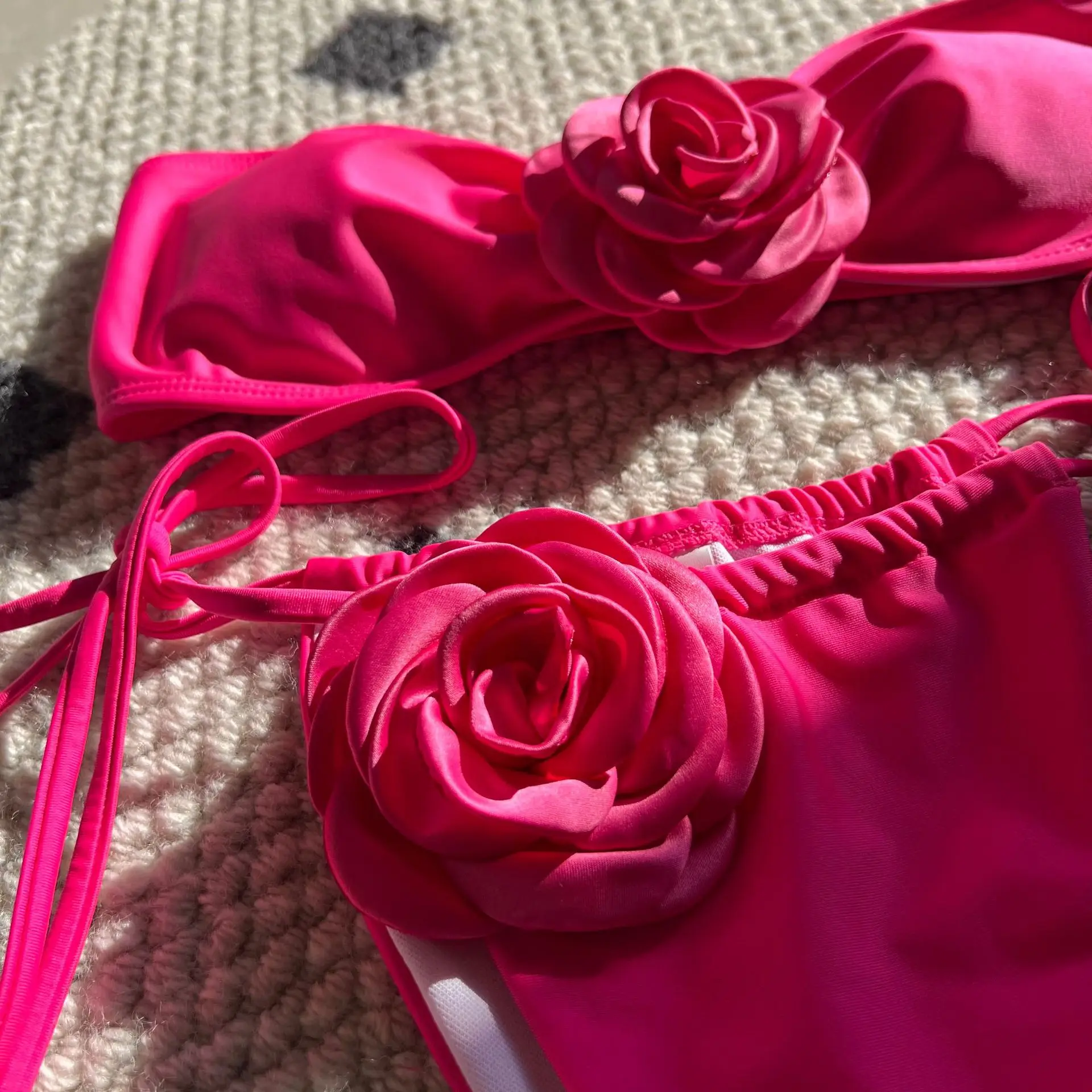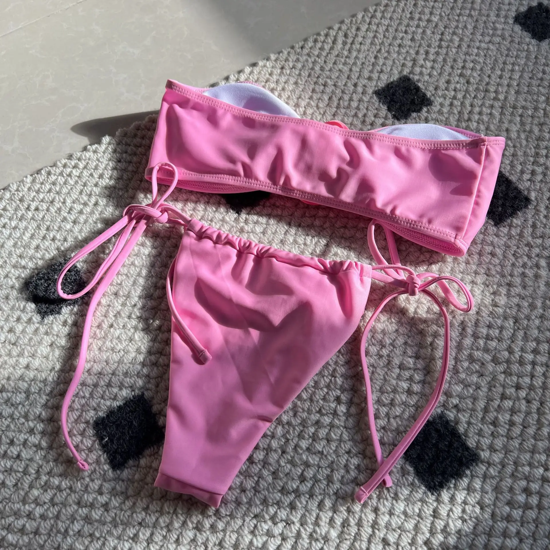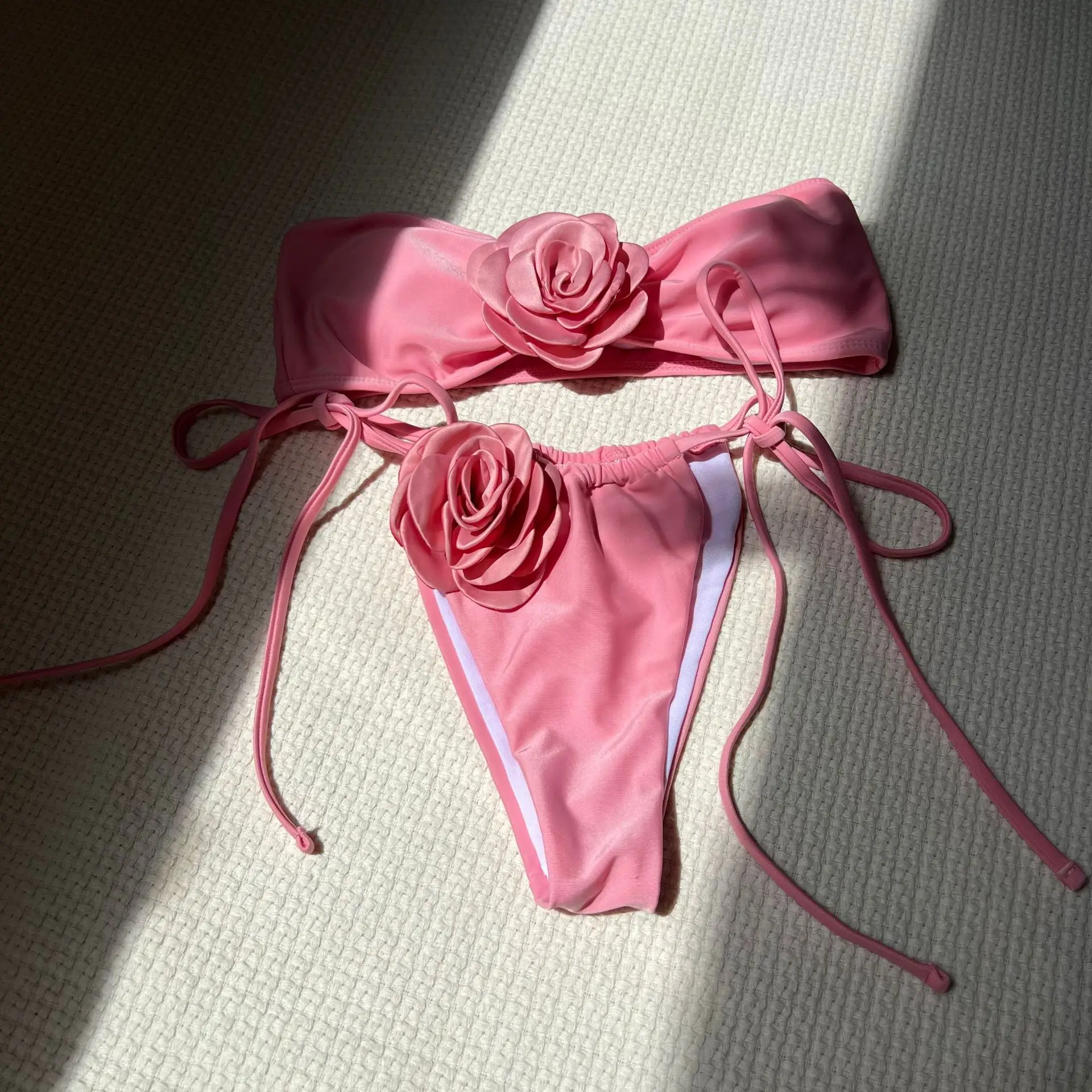 • Solid Rose Print Tube Top Tie-Up Adjustable Two-Piece Bikini Set Women Quick Dry Summer Beachwear Bikini Set Bathing Suit