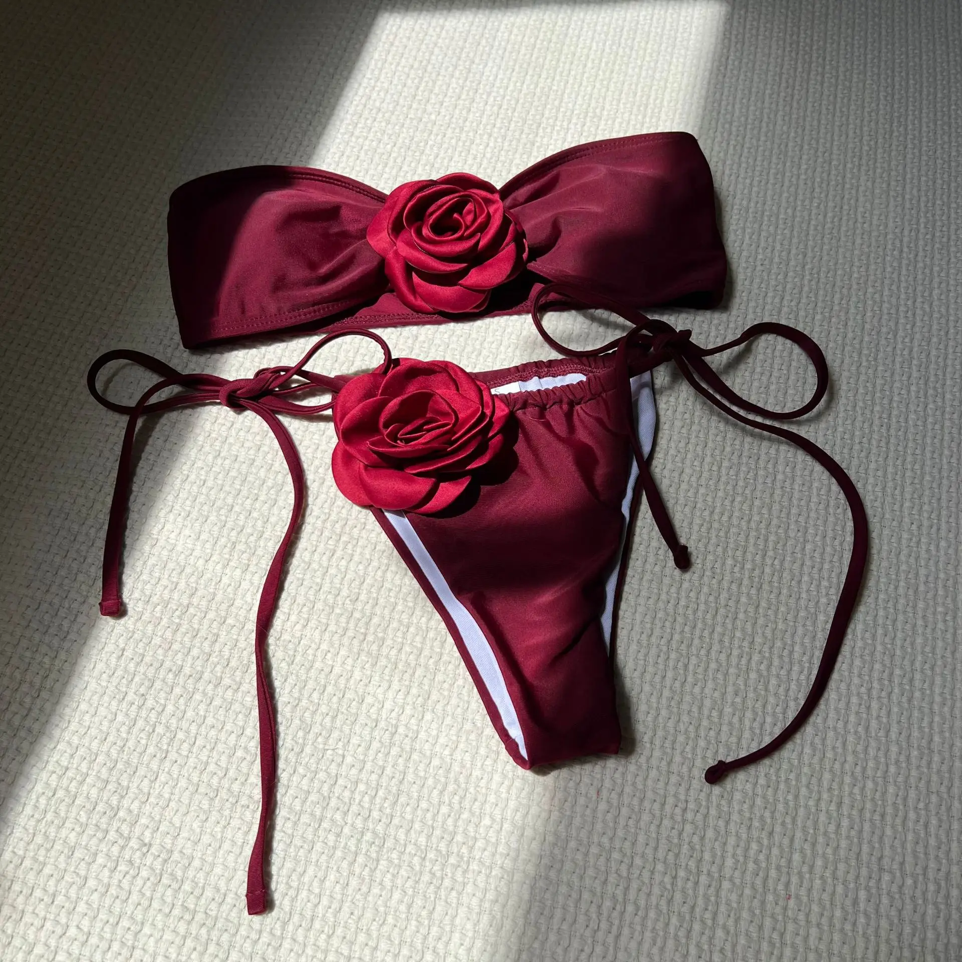 Solid Rose Print Tube Top Tie-Up Adjustable Two-Piece Bikini Set Women Quick Dry Summer Beachwear Bikini Set Bathing Suit